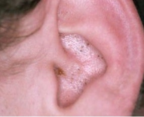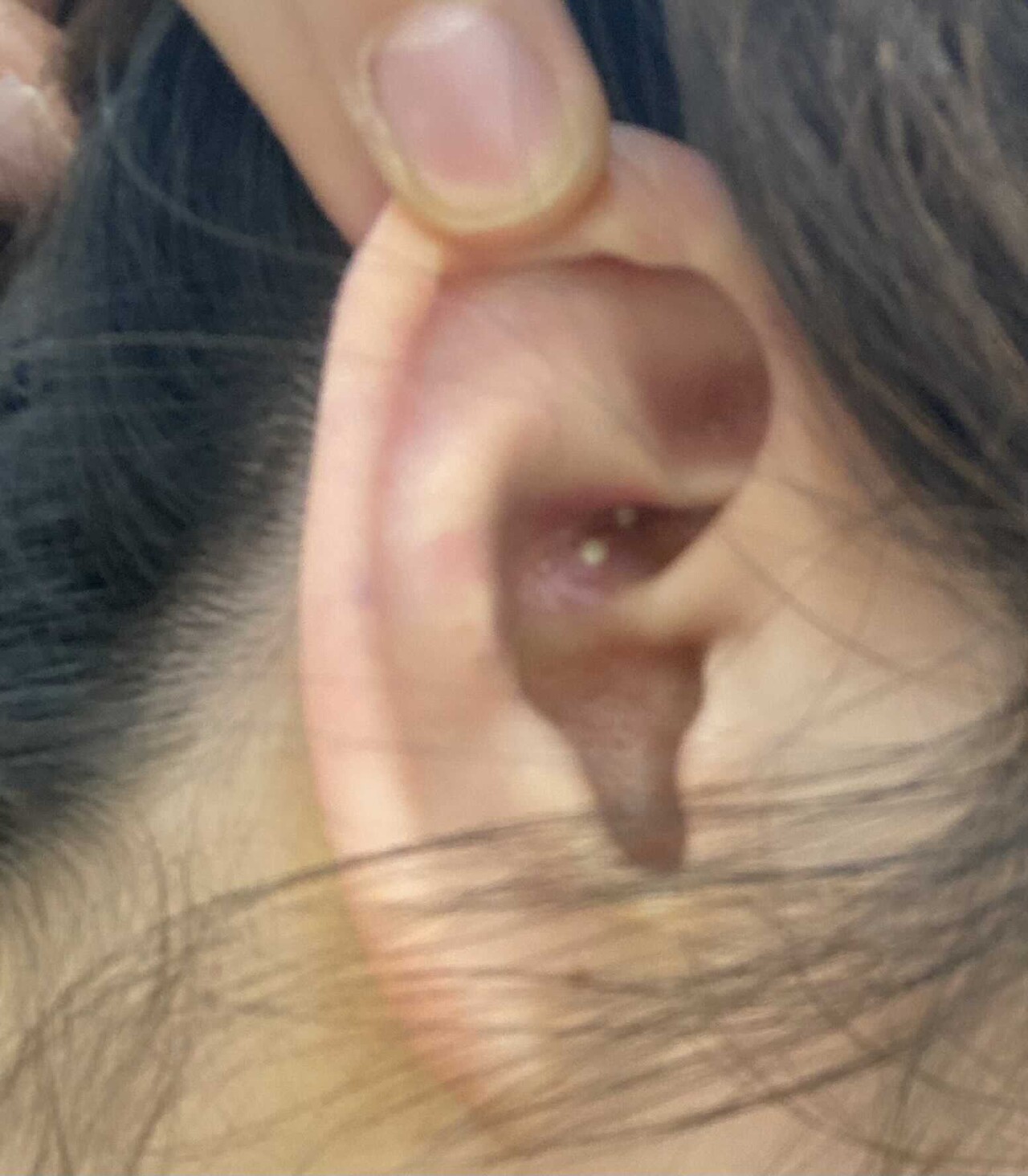 덩어리로 자라는 귀 주변의 여드름이나 종기? 피지낭종?