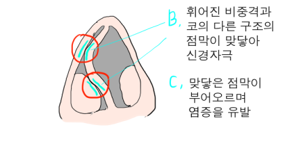 코막힘은 코점막의 혈관이 확장되어 부어오르면서 발생합니다. 또한, 비중격(왼쪽과 오른쪽 콧구멍을 나누는 휘어진 벽)이 휘어지는 등 코의 구조적 문제로 인해 코가 자주 막히는 경우도 있습니다. 코가 막히면 코가 막힐 수 있습니다. 콧물과 비슷한 개념으로, 바이러스나 알레르기 물질이 흡수되지 않도록 하는 신체 방어의 기능이라고 생각하시면 됩니다.