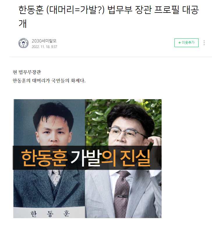 대중의 궁금증은 의외의 곳에서 드러났다. 한동훈 전 법무부 장관이 가발이다. 50대 초반이 보기에는 머리카락이 너무 굵고 부자연스럽다고 하네요.