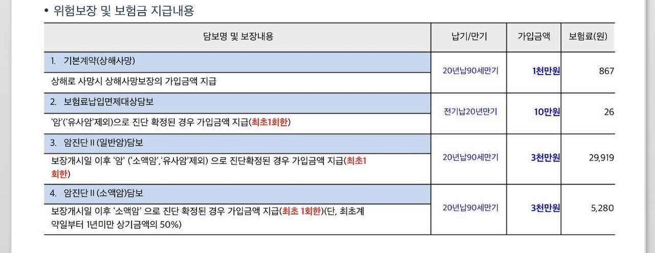 10년납부, 80년만기, 취소불가, 갱신불가 암보험 가입 후 면제기간과 감액기간이 적용됩니다. 면제시기는 보험금을 받지 못하는 시점이다. 면제기간이 종료되면 감면기간이 시작됩니다. 감액기간 중에는 보험료의 일부만 받을 수 있습니다. 15세 미만 어린이의 경우 면제시간, 감면시간이 적용되지 않으며, 2시간은 보험사에 따라 달라질 수 있습니다. 또한, 계약 전 반드시 보험회사에 본인의 나이, 직업, 성별, 과거 병력, 현재 건강상태 등을 사실대로 알려야 합니다. 보험회사는 위 의무사항을 바탕으로 보험료를 책정하고 가입심사를 실시합니다. 따라서 허위사실을 기재하거나 숨길 경우, 추후 보험금 지급 거부, 계약 해지 등의 불이익을 당할 수 있으므로 주의가 필요합니다. 보험계약을 유지하는 중에 피보험자의 정보가 변경된 경우에는 보험회사에도 이를 알려야 합니다. 변경사항을 제대로 알리지 아니하더라도 필수 공지사항을 준수하지 않은 것과 동일한 불이익이 발생할 수 있으니 주의하시기 바랍니다. 암 진단 후 치료를 위해 일정 기간 입원한 경우 입원비를 보장받을 수 있습니다. 있습니다. 진단비와는 다르게 입원비를 먼저 납부하신 후 서류를 첨부하여 보험금을 청구하시면 됩니다. 4대 암보험의 암 분류기준은 크게 4가지로 구분됩니다. 유사암, 고가암, 소액암, 일반암으로 분류되며, 종류별로 지급되는 보험금이 다릅니다. 일반암에는 가입금액 전액이 지급되며, 위장암, 간암, 폐암이 포함됩니다. 유사암이나 소형암의 경우 일반암 가입금액의 10% 또는 20%만 지급됩니다. 그 이유는 일반적인 암의 경우 치료비가 상대적으로 저렴하고 쉽게 제거될 가능성이 높기 때문이다. 유사한 암으로는 야전암, 기타 피부암, 갑상선암, 경계성 종양 등이 있고, 경미한 암으로는 전립선암, 방광암, 자궁경부암, 자궁체부암 등이 있습니다. 고가치암은 발생하면 치명적이고 치료비용도 많이 드는 흔한 암으로 뇌암, 백혈병, 골암 등이 있다. 보험사마다 암 분류기준이 다르기 때문에 잘 알아보시는 것이 좋습니다. 보험회사에서는 생체검사, 미세침흡입검사, 혈액검사 등을 암 진단의 기준으로 인정하고 있습니다. 한의원 등 일부 의료기관에서는 서류로는 진단비를 받기 어려울 수 있으므로, 보험사에서 요구하는 서류와 조치사항을 확인하시기 바랍니다. 난 그것을 추천 해. 4대 암보험 상품에는 다양한 암보험 약관이 있으며, 지급조건 및 가입금액이 다를 수 있습니다. 따라서 암이라는 질병은 재발 가능성이 있고, 처음으로 암 진단을 받은 이력이 있는 분들은 새로운 보험 가입이 어려울 수도 있습니다. 따라서 2차 암과 재진단된 암에 대해서는 진단비용을 초기에 지원하는 것이 좋을 수 있다. 주의할 점은 보험료가 더 높아질 가능성이 있고, 2차 암진단비까지 포함하면 원발암과 전이암까지 보장된다는 점이다. 상품에 따라 잔여암을 보장하는 온라인 암보험도 있으니 꼼꼼히 살펴보시기 바랍니다.