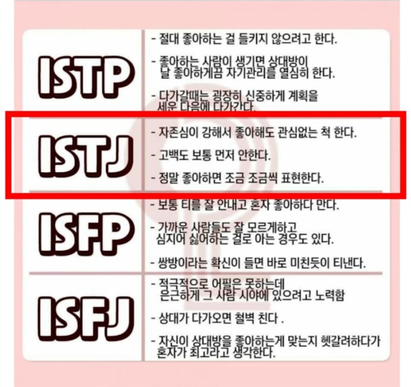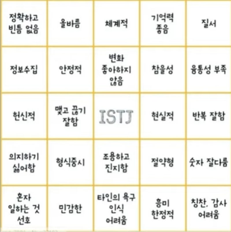 안녕하세요! 요즘 MBTI 이야기를 많이 하는 것 같아요. 이번에는 ISTJ의 특징, 남자 연애, 남자 매력에 대해 이야기해보겠습니다. 이와 함께 ISTJ 여성을 유혹하는 방법과 팩폭 빙고에는 어떤 것이 있는지도 함께 알아보겠습니다.