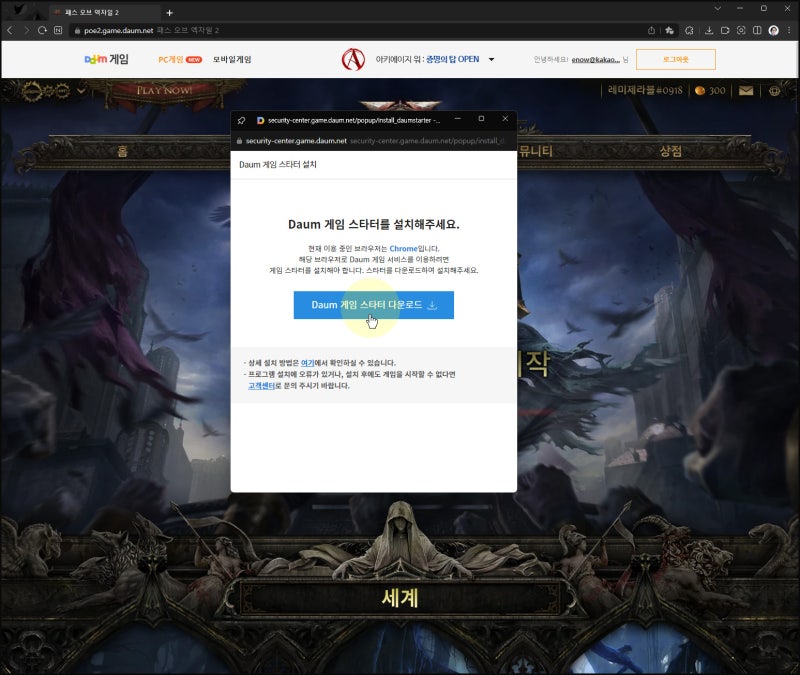 ▲ Daum Game Starter 프로그램을 다운로드하여 설치한 후, 이런 팝업창이 나타나면 (체크박스)를 선택하고 (DaumGameStarter 열기) 버튼을 눌러 다음번에 다시 질문하지 않도록 해주세요.